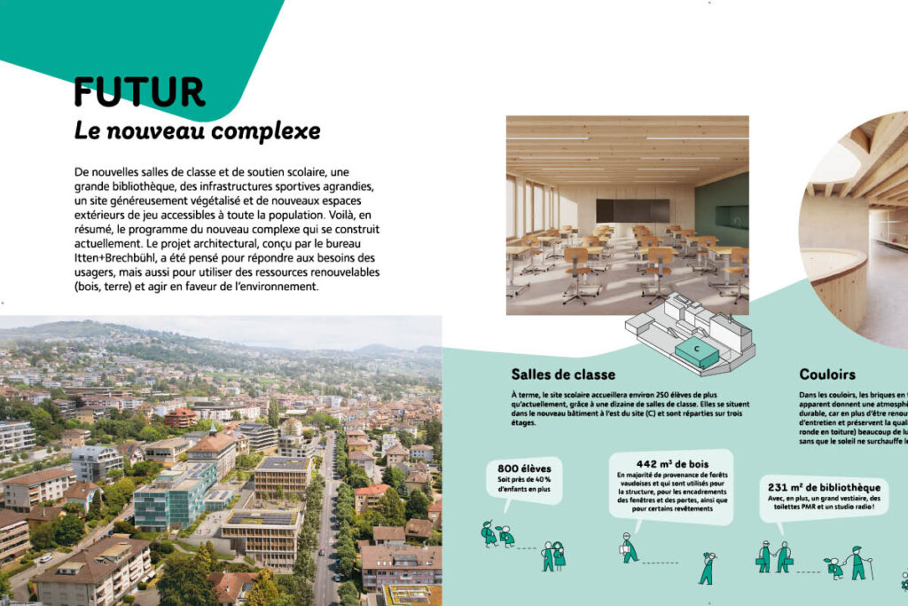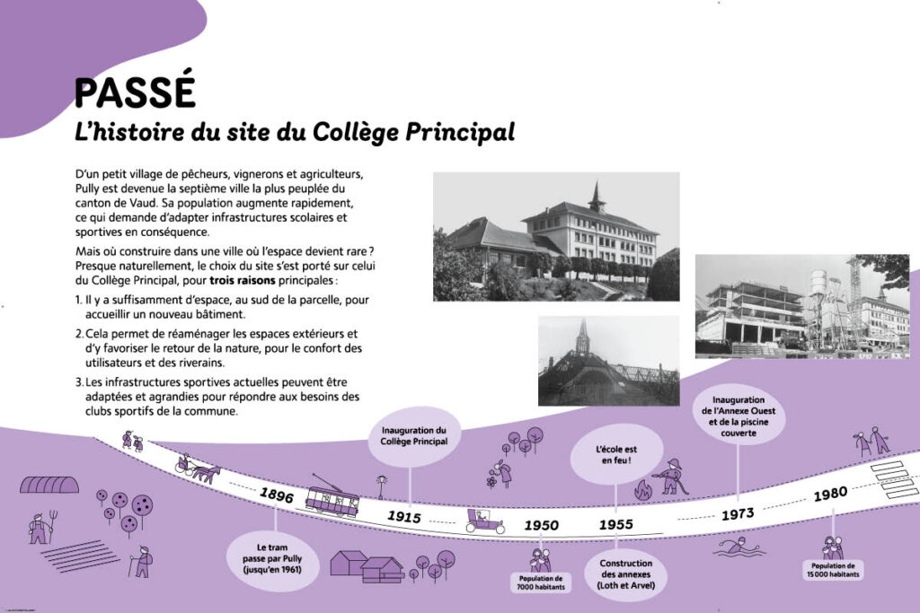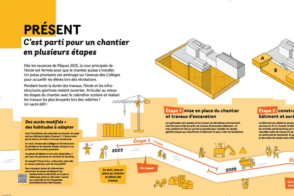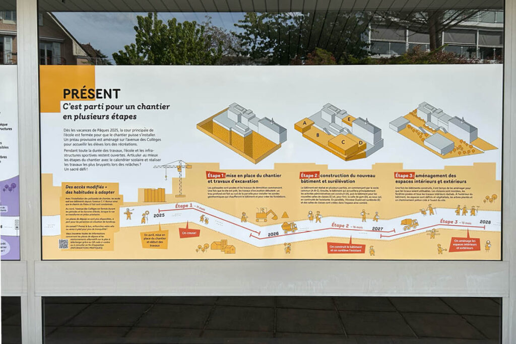 Panneaux explicatifs de chantier, collège de Pully, participation au projet mené par Oïkom Philippe Casse, maquette et réalisation, 2025